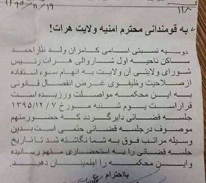 در پی مشخص شدن جلسه دادگاه کامران علی زایی رئیس شورای ولایتی هرات، سخنگوی این شورا به نامه احضاریه واکنش نشان داده و گفته است که از حکومت مرکزی به ویژه رییس جمهوری مجدانه خواستار توجه جدی به این دوسیه است. این نماینده شورای ولایتی پافشاری کرد که تصمیمهایی که آقای علیزایی گرفته، تصمیم و…